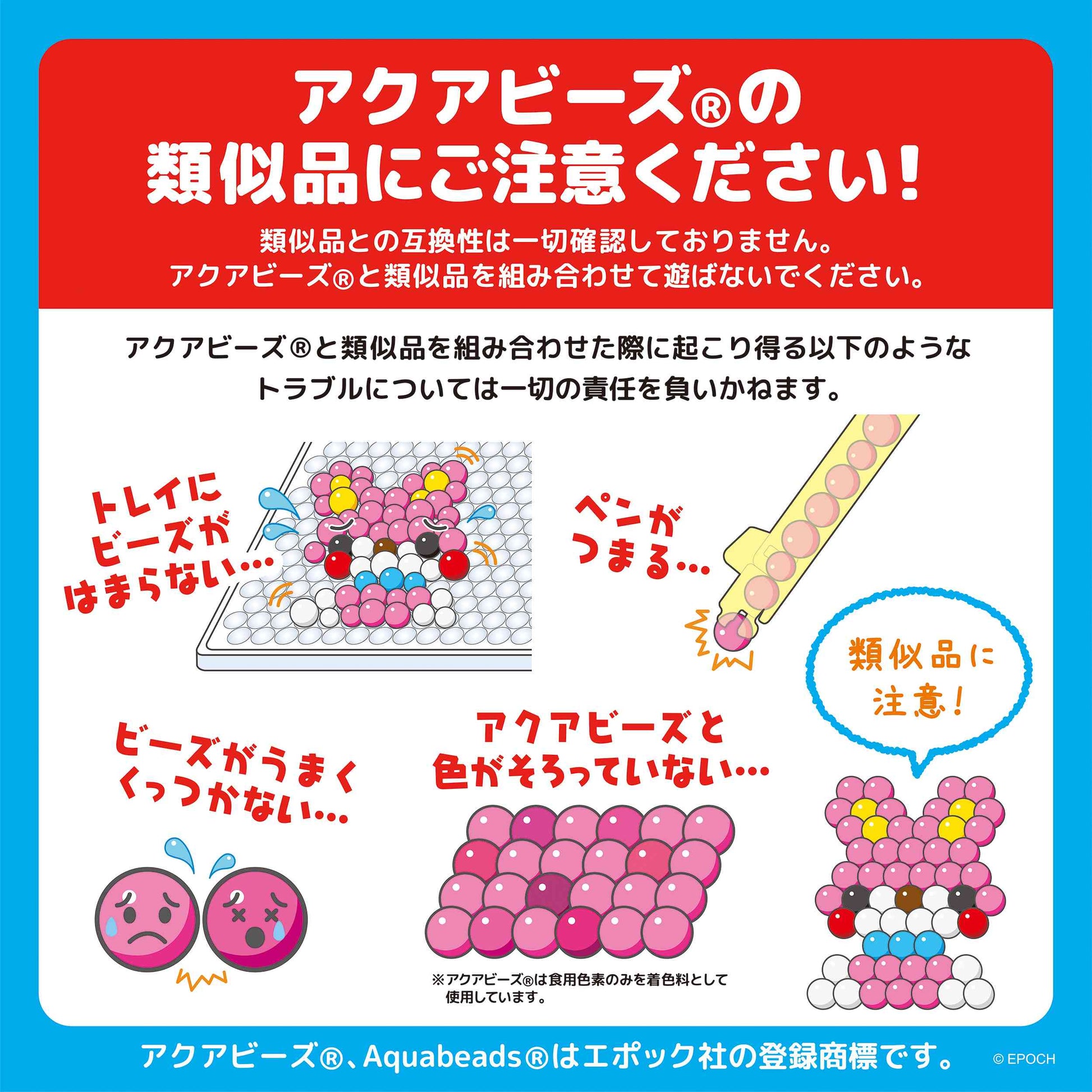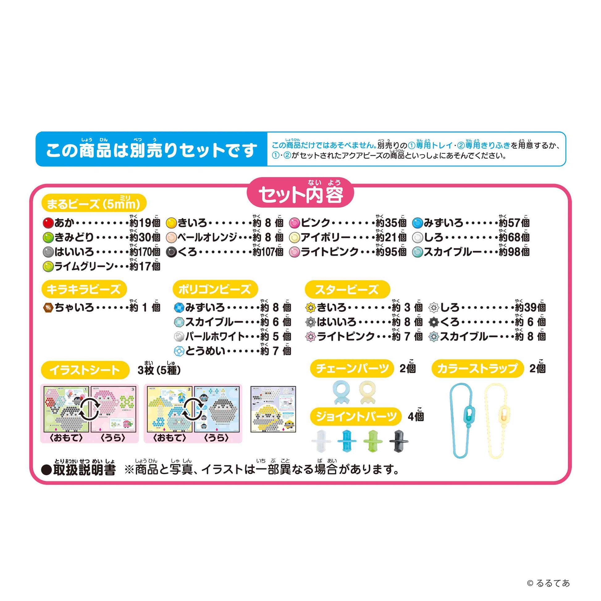 ※こちらの商品はビーズ・イラストシート・チェーンパーツ・カラーストラップ・ジョイントパーツがセットになった商品です。 別売りのアクアビーズ専用トレイと専用きりふき、またはそれらがセットになったアクアビーズ商品と一緒にお楽しみください。