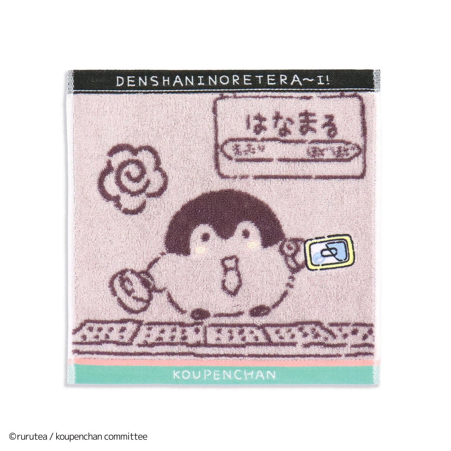 柔らかなパイルジャガード生地のミニハンカチ。コウペンちゃんが電車に乗るきみを応援してくれるよ♪